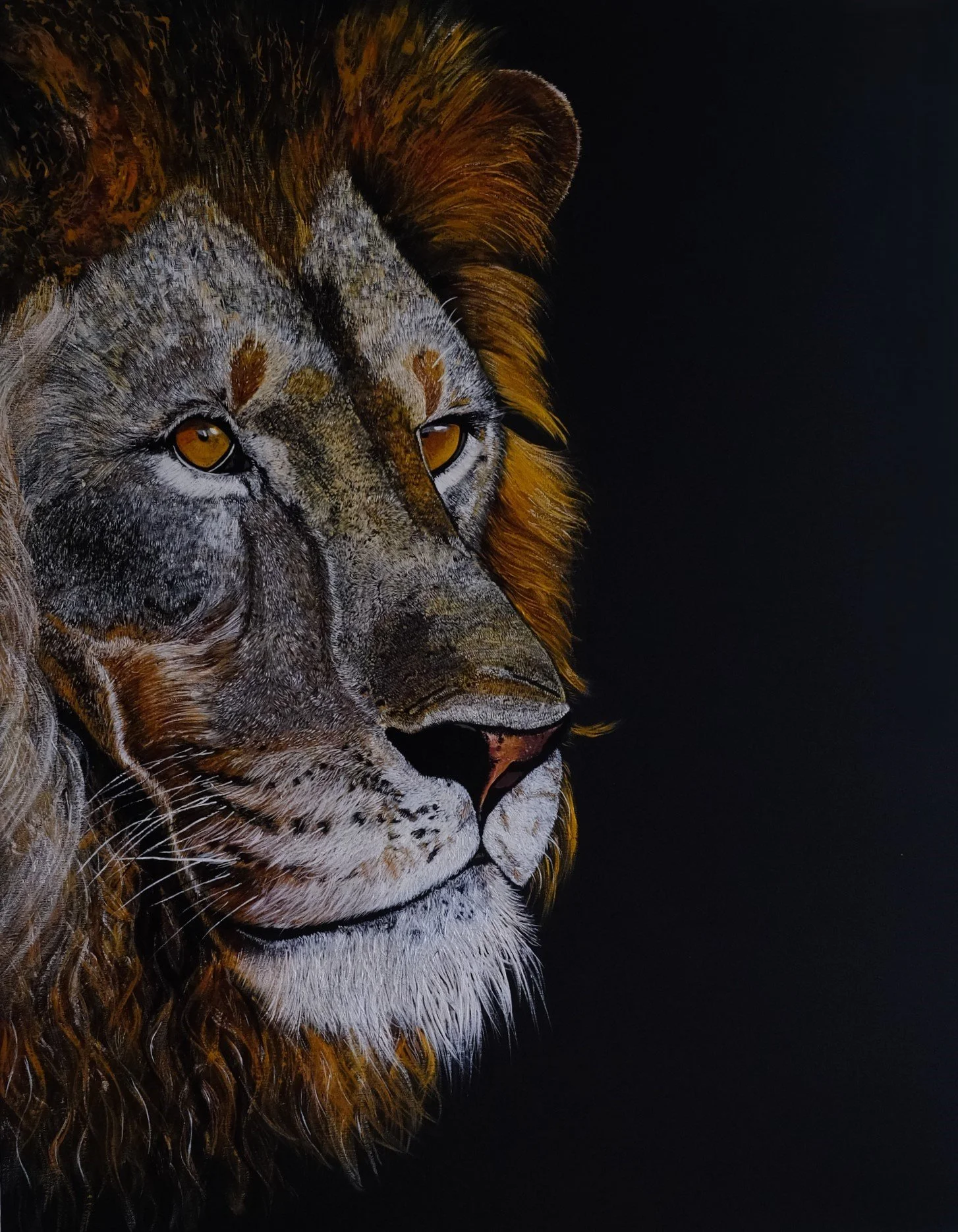 While painting this piece, I was struck by the profound peace and calmness radiated by the lion. Observing lions in nature, one notices their relaxed demeanor when they are not hunting. This tranquility stems from their inherent confidence, knowing they possess the power to kill at will. This level of inner confidence and discernment in demonstrating power is truly inspiring. It reminds that confidence is silent, insecurities are loud.