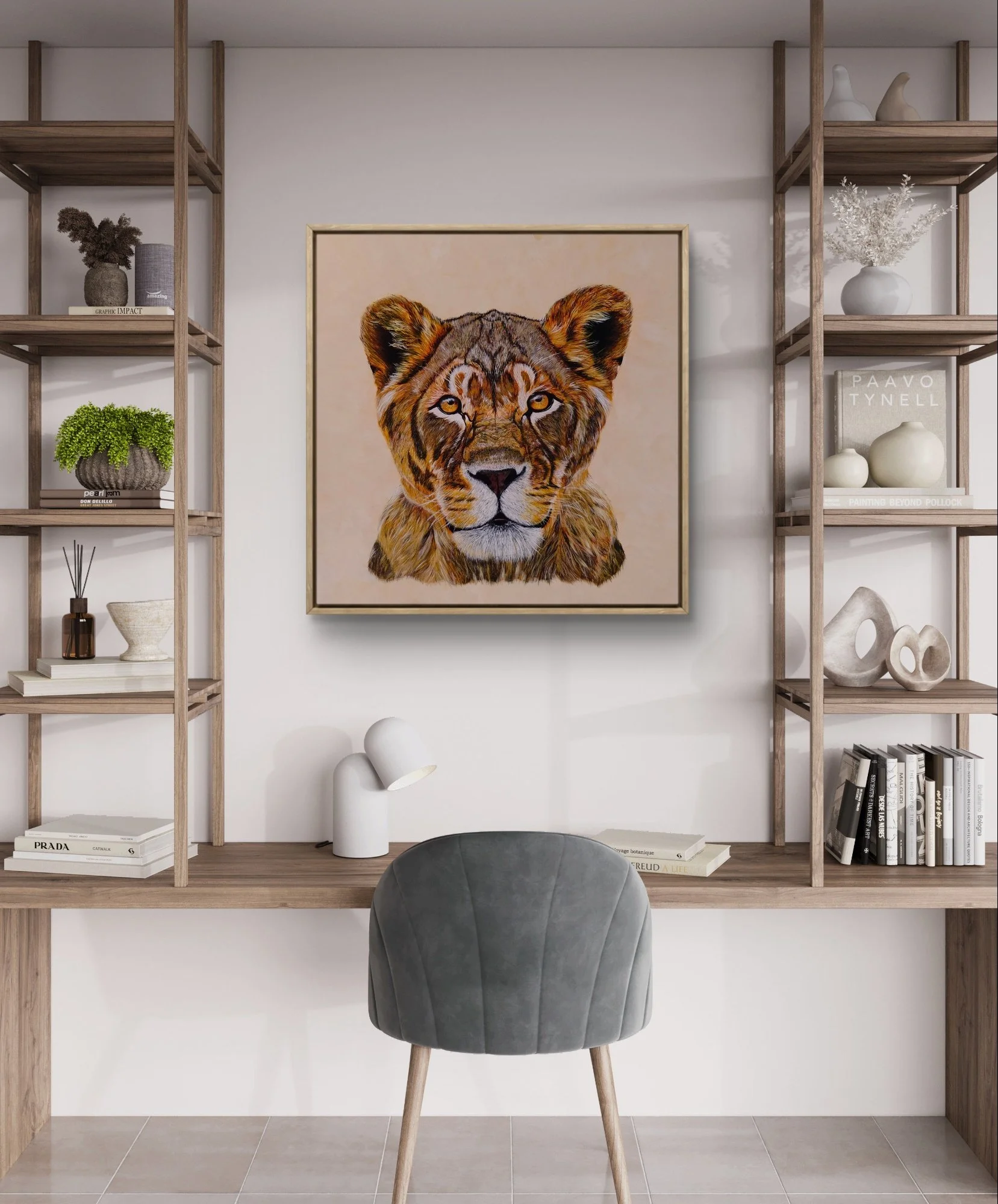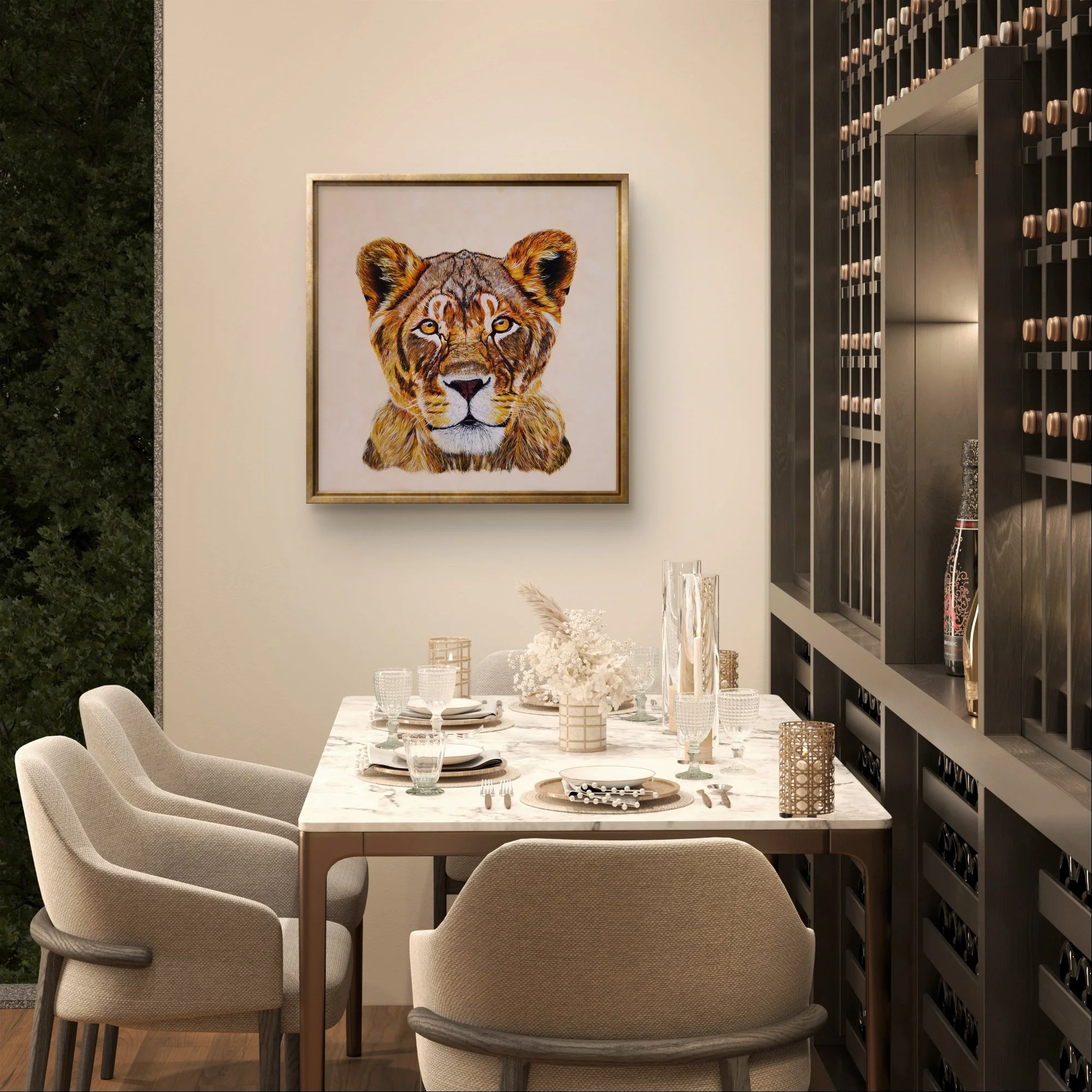 The strength of the lioness radiates through her poised stance, muscles coiled with latent energy, ready to spring into action at any moment. The intensity of her gaze speaks volumes of her fierce intelligence and unwavering determination. Each whisker, each ripple of fur, captures the raw vitality and majestic grace of a creature born to lead and protect. Through this painting, you can feel the pulse of her heart, the rhythm of her power — a testament to the invincible spirit that defines the lioness.